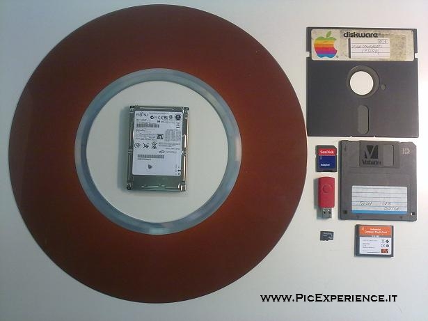 Tanto per rendere l'idea di come si sono evoluti i sistemi di memorizzazione nel giro di una ventina di anni, ecco una rassegna di dispositivi: si va dal disco di alluminio magnetizzato di un HD da 14 pollici fino alla piccolissima microSD. Le dimensioni dei dispositivi sono inversamente proporzionali alla capacità di memorizzazione.