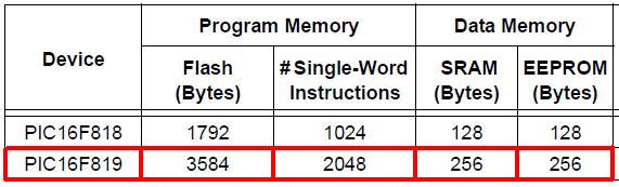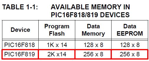 Dato che il datasheet si riferisce tanto al PIC16F818 quanto al PIC16F819, in rosso ho evidenziato le caratterische del PIC16F819. Riassumendo, ecco le caratteristiche del PIC16F819: