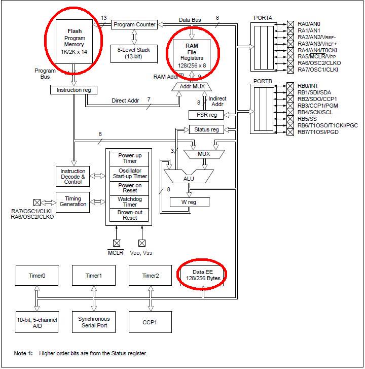 È giunto il momento di analizzare cosa contiene, in termini di memoria, un microcontrollore. La prima cosa da fare è scegliere un PICMicro ed aprire il suo datasheet. Ed ecco come si presenta l'architettura interna di un PIC16F819. In rosso ho evidenziato le tre memorie RAM, Flash ed EEPROM.