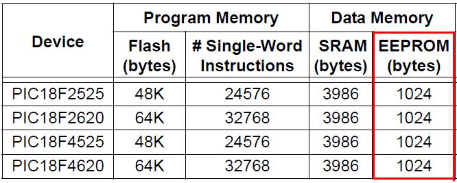 Cambia qualcosa con i PIC18F. Infatti per questi PIC è facile trovare dispositivi con tagli di EEPROM maggiori di 256 byte, per i quali i soli 8 bit di indirizzamento sono insufficienti. Il PIC18F4620, ad esempio, ha una EEPROM di 1024 byte, ossia pari a 1kbyte; per accedere a tale EEPROM è indispensabile impiegare un indirizzo ad almeno 10 bit.