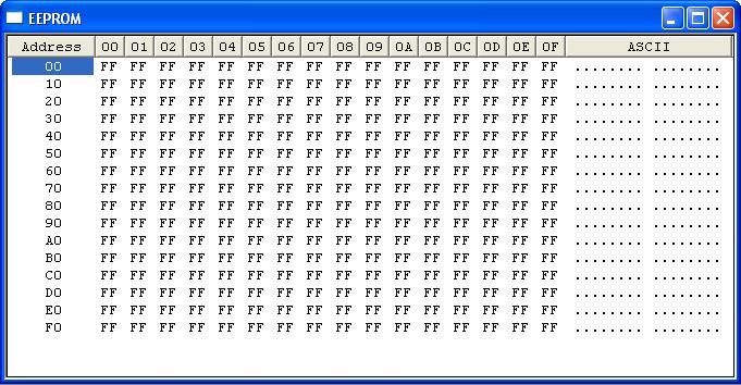 Il programma non fa altro che scrivere all'indirizzo 0 della EEPROM il valore esadecimale 0x55. Siccessivamente il programma accede nuovamente alla EEPROM interna per la lettura del dato all'indirizzo 0. Il valore letto viene poi utilizzato per pilotare PORTB. Per verificare che il valore scritto sia effettivamente presente in memoria, è sufficiente utilizzare MPLAB e richiedere lo stato della EEPROM interna. Prima della scrittura si presenta in questo modo: