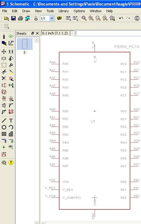 Analogamente, ecco come appare Pierin PIC18 quando lo si carica con EAGLE: simbolo per schematico e impronta PCB