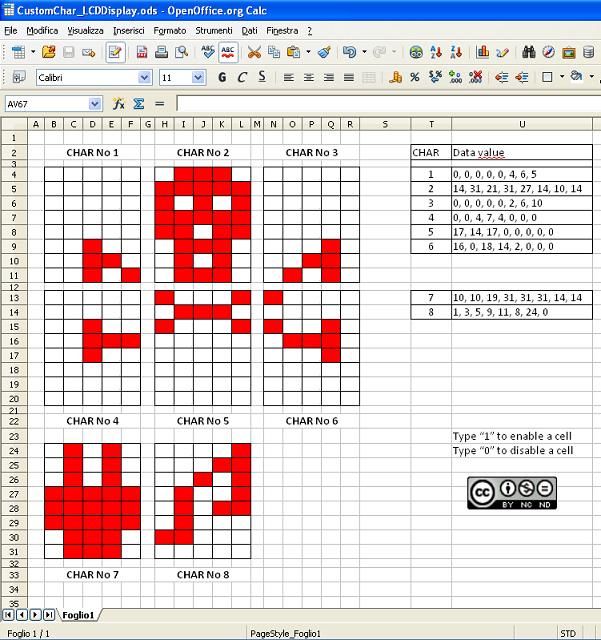 Ho voluto preparare una semplice applicazione per OpenOffice Calc, grazie alla quale è possibile creare i caratteri custom e poi utilizzarli nel proprio codice. L'applicazione calcola automaticamente i valori dei byte da inviare alla CGRAM del display.