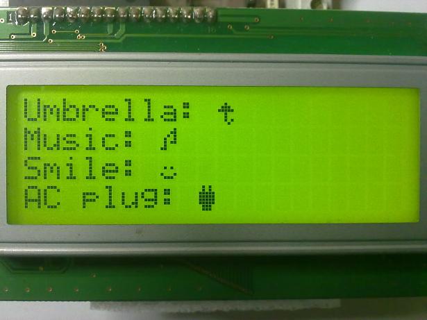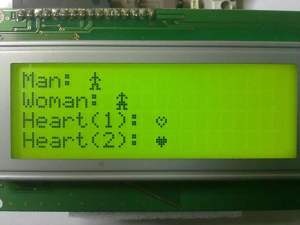 Le memorizzazione dei caratteri speciali avviene scrivendoli in un'area della memoria RAM del display, a partire dall'indirizo 0x40, infatti, ha sede la CGRAM, Charachter Generator RAM. Un comando di scrittura all'indirizzo desiderato, seguito dagli otto byte che costituiscono il carattere. Uno stralcio di codice è il seguente: