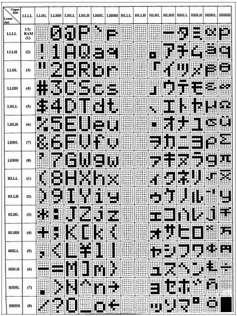 Ogni display ha a disposizione un set di caratteri piuttosto ampio. In figura è riportato un set tratto da un datasheet.