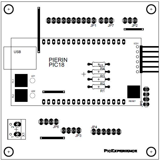Lo schema della scheda madre è piuttosto semplice, in quanto il grosso lo fa PIERIN PIC18. A parte il morsetto di connessione dell'alimentazione e un certo numero di pin strip, si trovano solamente 4 resistori. La scheda che ne è emersa ha dimensioni abbastanza contenute pari a 80x80mm, con quattro fori di fissaggio per distanziali