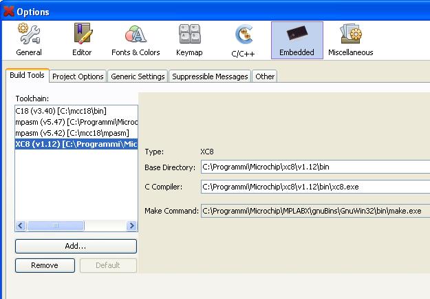 Per i PICMicro a 8 bit è disponibile XC8, scaricabile liberamente dal sito di Microchip. Nasce sostanzialmente da una evoluzione del compilatore PICC di Hi-Tech, software house che Microchip ha acquisito qualche da non molto; XC8 ha subito una maturazione, qualche miglioria (a detta della Casa) e certamente non ne mancheranno in futuro. Una cosa importante è che XC8 si integra alla perfezione in MPLABX ed è possibile eseguire compilazioni, trasferimenti e debugging direttamente da MPLABX. Una volta scaricato e installato, MPLABX avvisa che è disponibile un nuovo compilatore; dal menu TOOLS, scegliendo la voce OPTIONS e successivamente Embedded si ha modo di verificare che il compilatore sia stato caricato e che i percorsi dei file eseguibili siano corretti.