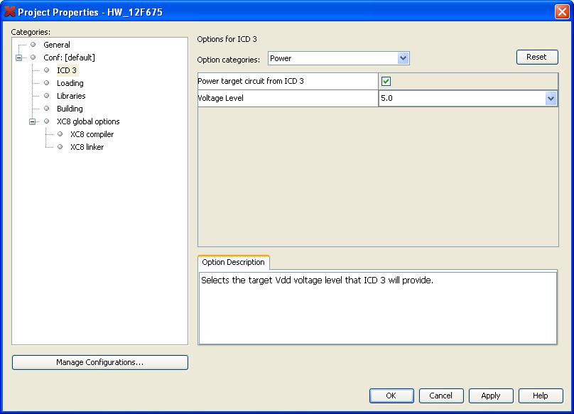 Per alimentare il circuito con la sola tensione fornita da ICD3 è sufficiente tornare nelle impostazioni di progetto e, nella voce ICD3 selezionare la voce POWER e successivamente spuntare la voce POWER TARGET CIRCUIT FROM ICD3: