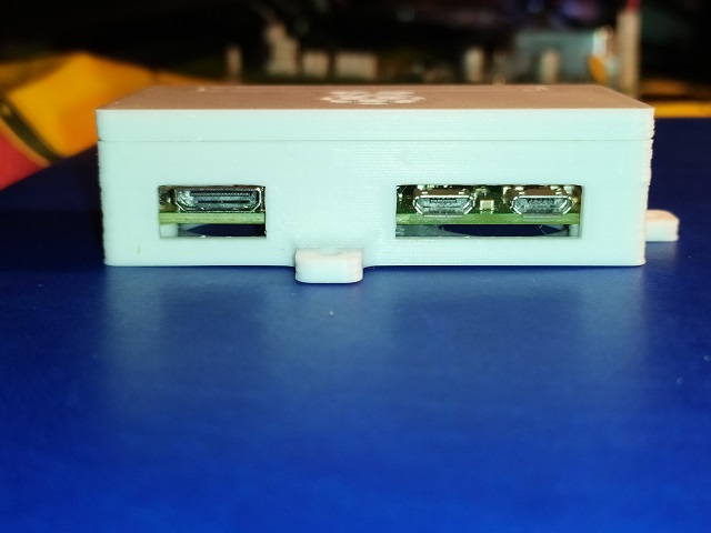 Il coperchio presenta un paio di sporgenze su ciascun lato lungo e il corpo inferiore ha delle sedi in grado di ospitare proprio quelle sporgenze, realizzando così l'incastro. Inoltre, nella parte inferiore della scatola, ho realizzato due fori che permettono di spingere con i pollici la scheda verso l'alto, per estrarla. Inoltre le pareti laterali presentano delle finestrelle per l'accesso ai connettori della scheda.
