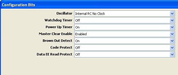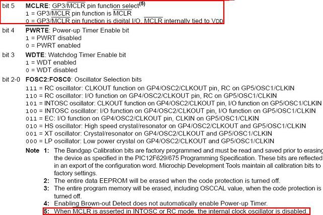 Si faccia attenzione ad un aspetto molto importante. Benché PIC12F675 permetta l'adozione dell'oscillatore interno al posto di quello esterno, questa selezione esclude in modo categorico l'impiego del MASTER CLEAR interno! Questo aspetto è citato nel datasheet, pertanto è necessario porre una resistenza di pull-up esterna per MCLR ed impostare il compilatore in modo opportuno.
