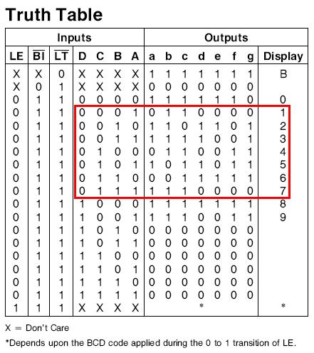 Osservando la tabella della verità del CD4511 si nota come dei quattro bit di controllo ne bastino solo 3 per rappresentare i numeri da 1 a 7.