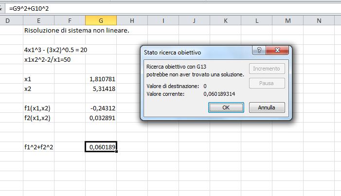 , mediante il menu Excel (versione 2010), si va alle schede Dati-->Analisi Simulazione e si sceglie "ricerca obbiettivo"; si apre la scheda e s'impone per la cella, dove e' il valore della somma dei quadrati delle due funzioni f1 e f2, il valore 0, come, deve essere. Infine, si impone il cambiamento di una delle due soluzioni iniziali o x1 o x2.