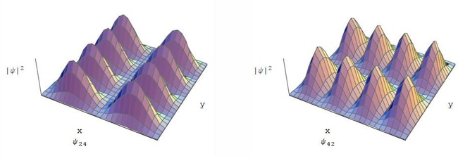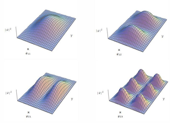 Anche la funzione d'onda ψ(x,y) dipende dai numeri quantici nx e ny e per ogni coppia di essi ha una sua configurazione nello spazio. Sotto, gli andamenti della probabilita' | ψ(m,n) | 2, per le coppie di numeri quantici (1,1), (1,2), (2,1), (2,3), (2,4),(4,2).