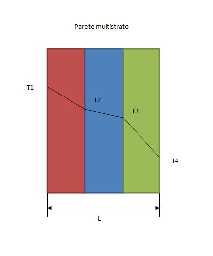 Quindi la parete multistrato viene trattata termicamente, come una somma di resistenze termiche, su cui cade una tensione (temperatura) totale T1-T4, attraverso le quali scorre una corrente pari a Q.