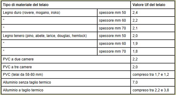 - il valore di UF del telaio, per tipi di materiali e spessori e con gas