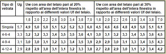 Tabella 7. Tabella per valori di trasmittanza termica dell'infisso e dell'elemento vetrato, in funzione della vetratura - Fonte UNI EN ISO 10077-1 prospetti F1 e F2, allegato F.