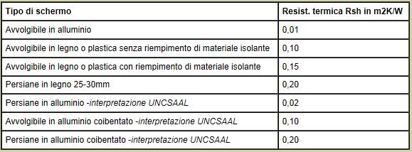 Tabella 8. Resistenza termica di una tapparella e/o serranda per serramento a seconda del materiale impiegato.