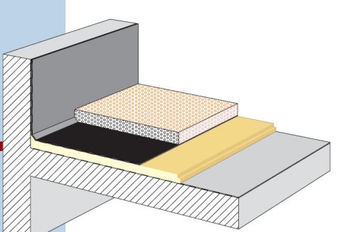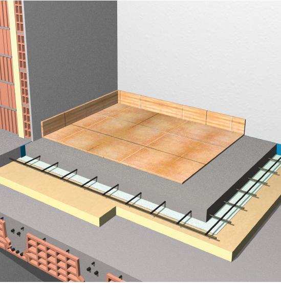 Questa applicazione consente inoltre di realizzare un pavimento galleggiante in grado di attenuare la trasmissione di rumori da calpestio o percussione impattivi, in combinazione con l’adeguata formazione dei risvolti sino al battiscopa per la configurazione di un’unità autonoma sotto l’aspetto acustico.