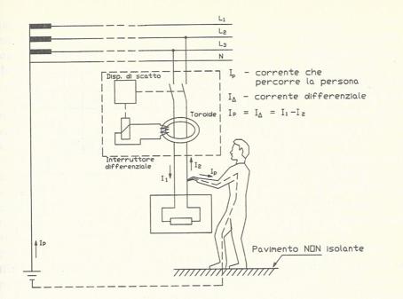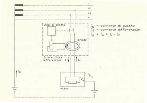 si creano due avvolgimenti agli antipodi su una struttura toroidale magnetica, che hanno il sensi opposti, in modo che le correnti uguali che vi scorrono creino due campi magnetici nel toro che si elidono perché opposti. A 90 gradi da uno dei due precedenti avvolgimenti se ne crea uno nuovo, che ha funzione captante di una eventuale variazione di flusso del vettore H magnetico del toro stesso. I primi due avvolgimenti fanno parte del filo di andata e di ritorno di un utilizzatore posto a valle. Se nell'utilizzatore si crea una dispersione di corrente, ovvero un contatto indesiderato per perdita d' isolamento,le correnti di andata e di ritorno verso la struttura toroidale sono diverse e di conseguenza creano per lo sbilanciamento una tensione nel terzo avvolgimento, che a sua volta, va a comandare un'elettrocalamita, che interrompe il circuito di corrente a monte. Per questo, tale interruttore a volte e' chiamato salvavita, in quanto se una persona tocca una parte di un dispositivo che ha perso l'isolamento elettrico, non riceve più la scossa elettrica, in quanto l'erogazione di energia elettrica viene a cessare. Da cosa e' creato questo sbilanciamento di correnti di andata e ritorno da e verso il generatore? Dall'aggiunta di un nuovo ramo elettrico del circuito costituito dalla causa del contatto (una persona, ad esempio), che fa scaricare a terra la corrente attraverso di essa, chiudendo l'anello sino al punto di generazione. Ma il passaggio di corrente non crea danni, perché l'interruttore scatta subito, poiché e' tarato con un valore di soglia, per la corrente differenziale (quella che scorre nel terzo avvolgimento),che per i casi comuni civili e' pari a 30 mA. Sicuramente la corrente di dispersione eguaglia quella differenziale e questo facilita la progettazione del dispositivo, in quanto s'impone che la tensione di guasto o di contatto sia minore o uguale a 50 Volt per ambienti secchi e 25 Volt, per quelli umidi. Ma questa tensione viene messa in relazione con il prodotto tra la resistenza di terra e la corrente di dispersione, consentendo di progettare resistenze di terre sui Kohm, poi che' la sensibilità' dei differenziali e' bassa. Questo criterio di progetto non va bene invece per magnetotermici, che, per le loro alte correnti d' intervento richiederebbero resistenze di terra di decimi di ohm, che sono difficilmente realizzabili.