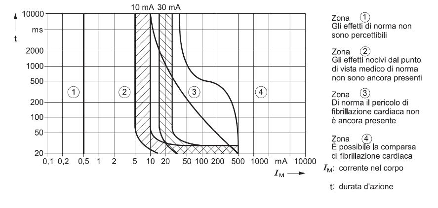 Le zone tempo-corrente d'intervento degli interruttori differenziali sono individuate nella comparazione delle aree di pericolosità' della corrente in Fig. 3.