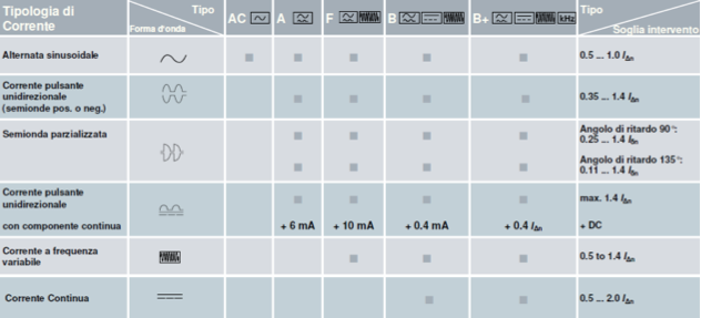 In relazione alle correnti di dispersione a cui l'interruttore differenziale è sensibile le norme prevedono una classificazione in tre tipi, AC, A, F B e B+.