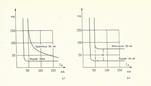 - differenziando le curve d'intervento in funzione della portata, in modo che l'interruttore a monte, di portata superiore, a parità' di corrente differenziale, abbia un tempo d'intervento più' lungo, permettendo così' l'intervento del solo intervento a valle (selettività' verticale).