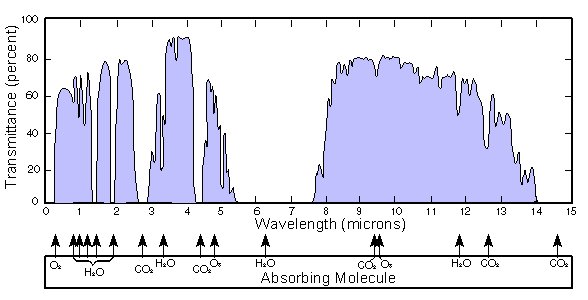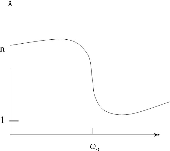 Sotto sono riportati sotto due grafici, relativi alla parte reale ed immaginaria dell'indice di rifrazione. Come si vede, per la parte immaginaria, che rappresenta il fattore di perdita o di assorbimento dell'onda elettromagnetica che si propaga nel dielettrico, esiste una frequenza di risonanza dove appunto le perdite di energia dell'onda sono massime. Questo significa che ogni materiale o sostanza ha una frequenza caratteristica dove l'energia dell'onda viene massimamente assorbita. Se per esempio consideriamo l'atmosfera terrestre che e' composta da un miscuglio di gas, avremo uno spettro di assorbimento con vari picchi dovuti alla presenza varie sostanze, come si vede in Fig. 3.