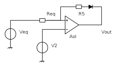 Tanto per farla breve, supponiamo che l'opamp sia alimentato a tensione duale e che l'uscita possa variare tra +V_\text{sat} e -V_\text{sat}. Ora se v_\text{out}=+V_\text{sat} il diodo non conduce e l'uscita rimane a +V_\text{sat} se V_\text{eq}>V_2. Se V_2 diventa maggiore di V_\text{eq}, allora l'uscita commuta a -V_\text{sat} e il diodo entra in conduzione. Supponendo che il diodo possa essere considerato ideale (tanto per farla facile), la tensione sul piedino non invertente dell'operazionale diventa