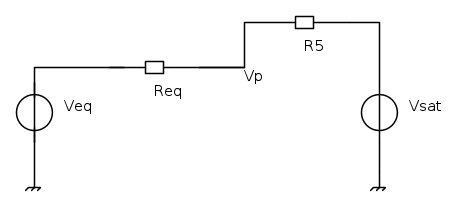 v_\text{P} = V_\text{eq}\frac{R_5}{R_\text{eq}+R_5}-V_\text{sat}\frac{R_\text{eq}}{R_\text{eq}+R_5}