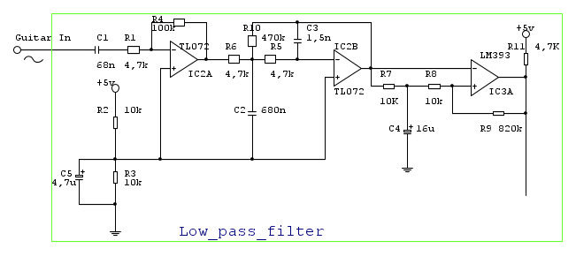Oppure con l' oscilloscopio verifichi che all' uscita di IC2B ci sia segnale quando suoni la chitarra.