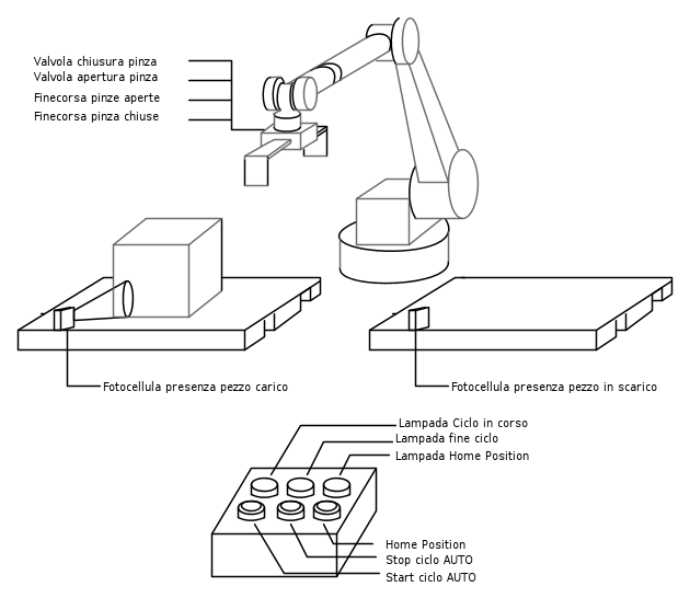 - hai fatto uno schema elettrico di come collegare PLC e Robot, ad un quadretto di alimentazione e ad una pulsantiera di comando?