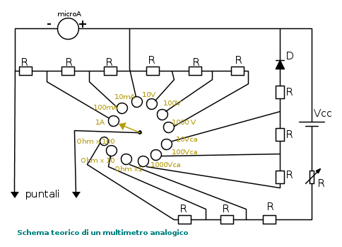 in un multimetro analogico come indicato c'è la resistenza interna propria dello strumento a bobina mobile ed il resistore serie addizionale per le varie portate di misura.