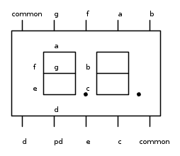 I segmenti sono in comune per le due cifre e resta da stabilire se siano ad anodo o a catodo comune; e' comunque facile provarlo .