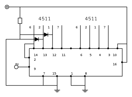 ho incominciato con lo schema che mi ai dato, ma non funzionava... (il collegamento a massa dei piedini 7 e 15 non ci deve essere e i due 4511 devono essere invertiti cioè il primo al posto del secondo e viceversa)
