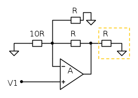 Nel caso, se non erro, Aout dovrebbe essere pari ad una sovrapposizione di effetti: un amplificatore non invertente ed un partitore di tensione per resistenze (evidenziato), giusto?