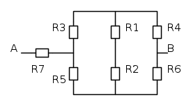 a sto punto trasformerei da stella a triangolo le R3, R5 ed R7, ottenendo (non chiedermi le formule, che è na vota che non le uso...)