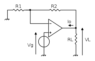 I2=\frac{Vg-Vo}{R2}=\frac{4-24}{10}= -2mA\] \[Vo =\left ( \frac{R2}{R1}+1 \right )*Vg = \left ( \frac{10}{2}+1\right )*4=24 V;