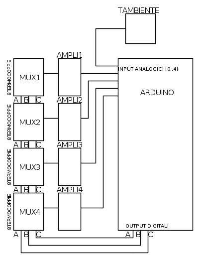 Per quanto riguarda il multiplexing volevo gestire 4 gruppi da 8 termocoppie ciascuno, le uscite dei MUX sarebbero poi amplificate da 4 circuiti amplificatori separati e collegati a 4 ingressi analogici del micro.