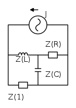 Per trovare la resistenza equivalente parto dal parallelo di Z(C) e Z(R), la risultante la sommo in serie con Z(L) e con quello che trovo ne faccio il parallelo con Z(1), arrivando a:
