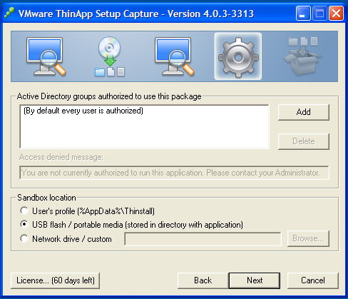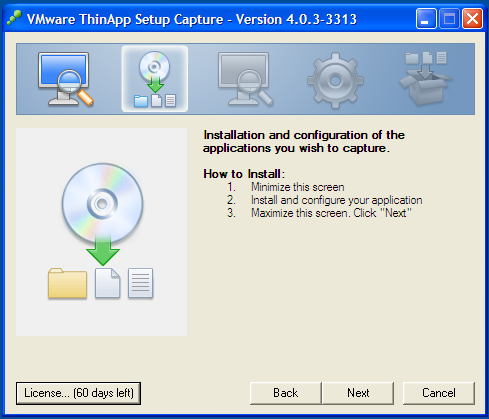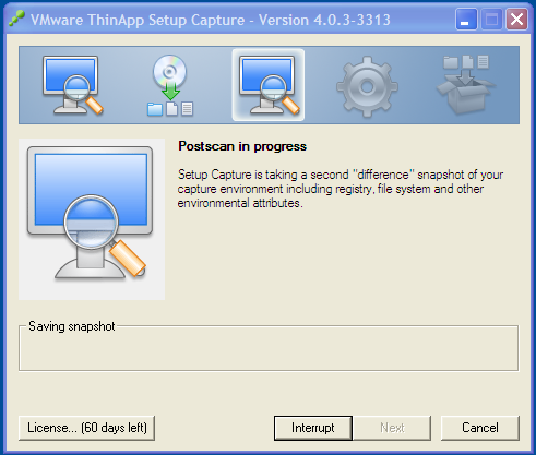 Utilizzeremo ThinApp Setup Capture, che scatterà due istantanee del sistema in modo da catturare tutti i files e le chiavi relative al programma da virtualizzare.