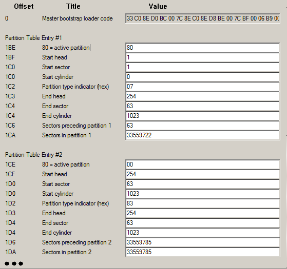 Abbiamo detto che nel primo settore c'e' l'MBR (Master Boot Record) e che questo contiene un programmino d'avvio, bene dopo questo ha inizio la tabella delle partizioni e le eventuali copie. Ciò che si può vedere nell'immagine e' la lettura della tabella delle partizioni (in una macchina adibita a cavia). Come vedete sono indicati i limiti di ogni partizione espressi in bytes (dimensione e posizione relativa (offset), e la relativa geometria: testina, settore,cilindro), questo è il sistema di paletti che definisce la struttura di base di un disco.