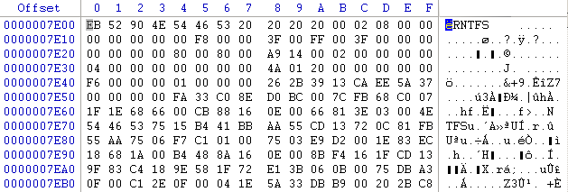 L'immagine rappresenta la posizione ed il contenuto della prima partizione in esame (naturalmente una piccola parte); da notare che come il primo settore del supporto e' dedicato all'MBR, ogni partizione può avere un suo settore d'avvio (boot record).
