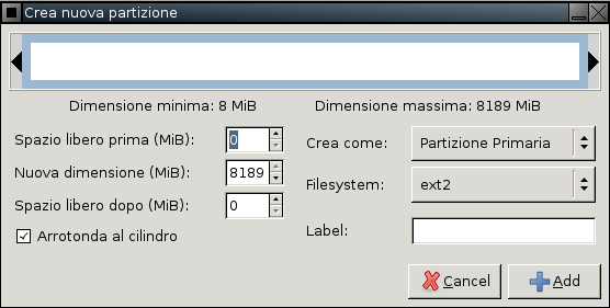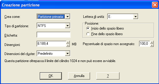Questa e' la finestra di creazione delle partizioni, potremo specificare tutti i parametri fondamentali, ci viene richiesto infatti di indicare: