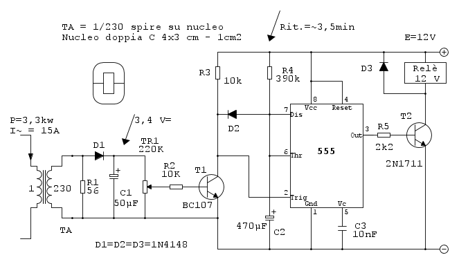Il tempo di ritardo, che non è critico, varia tra i tre e i quattro minuti e dipende dalle tolleranze dei componenti. Se durante questo tempo il FV ritorna a produrre potenza il circuito si resetta ed il relè rimane sempre attivo (ovvero stufetta accesa) altrimenti passati i tre minuti si stacca ed attende paziente il ritorno del sole.