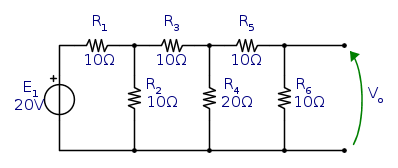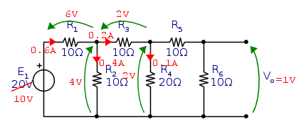 Scelgo Vo=1V. Se su R6 c'è 1V, su R4 ci saranno 2V, poichè R5 e R6 sono uguali. In R3 scorrono quindi 0.2 A e su R2 sono presenti 4 V e scorrono 0.4 A. In R1 scorrono quindi 0.6 A, cadono 6 V e quindi E1 deve valere 10 V.