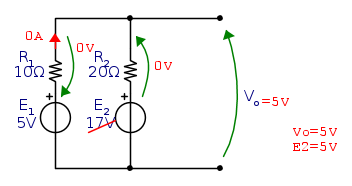 Come seconda scelta, impongo Vo=5V, perchè se faccio così la tensione su R1 dovrà essere nulla e la corrente che scorre nella maglia sarà altrettanto nulla. Questo significa che E2 deve valere 5V.
