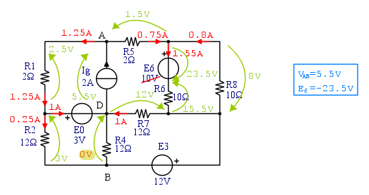 Scelgo E6 come generatore da far variare e impongo, nel primo circuito VR7=0. Riporto quindi sullo schema tutte le tensioni e le correnti che mi servono, cominciando dalla tensione su R4, che è pari a E3, essendo VR7=0...