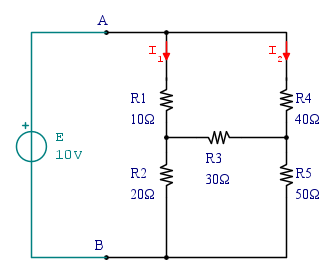 Per valutare la resistenza equivalente applico ai morsetti AB un generatore di tensione pari a 10V e valuto la corrente che la rete assorbe, la quale, come ho disegnato, si divide in I1 e I2.