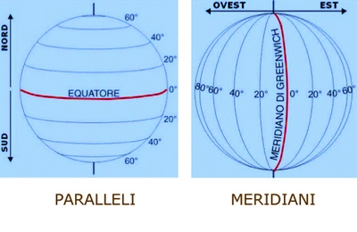 E' come ricoprire la Terra con un reticolo. Partendo dall'equatore che è il parallelo 0° aggiungiamo altri paralleli verso Nord e verso Sud fino ad arrivare ai 2 poli dove avremo 90°N per il polo Nord e 90°S per il polo Sud. Partendo invece dal meridiano di Greenwich aggiungiamo altri meridiani da entrambi i lati per tutta la circonferenza terrestre così da avere, andando verso Ovest, tutti i meridiani che vanno da 0° a 180°O, ed andando verso Est, tutti i meridiani che vanno da 0° a 180°E (180° è esattamente il meridiano opposto a quello di Greenwich). Se volessimo così indicare le coordinate esatte dell'obelisco che si trova al centro di Piazza San Pietro a Roma diciamo che sono 41°54'08"N e 12°27'26"E, cioè poco più di 41° alzandoci dall'equatore verso Nord e poco più di 12° spostandosi dal meridiano di Greenwich verso l'India.