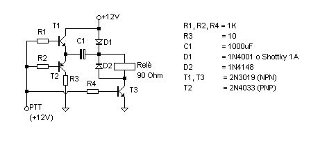 Con la presenza di +12V sul punto PTT, T2 si interdice, T3 e T1 si saturano e in questo momento, C1 si trova connesso al +12V con l'armatura negativa ed al relè con quella positiva sommando così la sua tensione ai +12V; in questo preciso istante il relè attrae con la corrente di scarica di C1 e si mantiene sul +12V tramite D1.